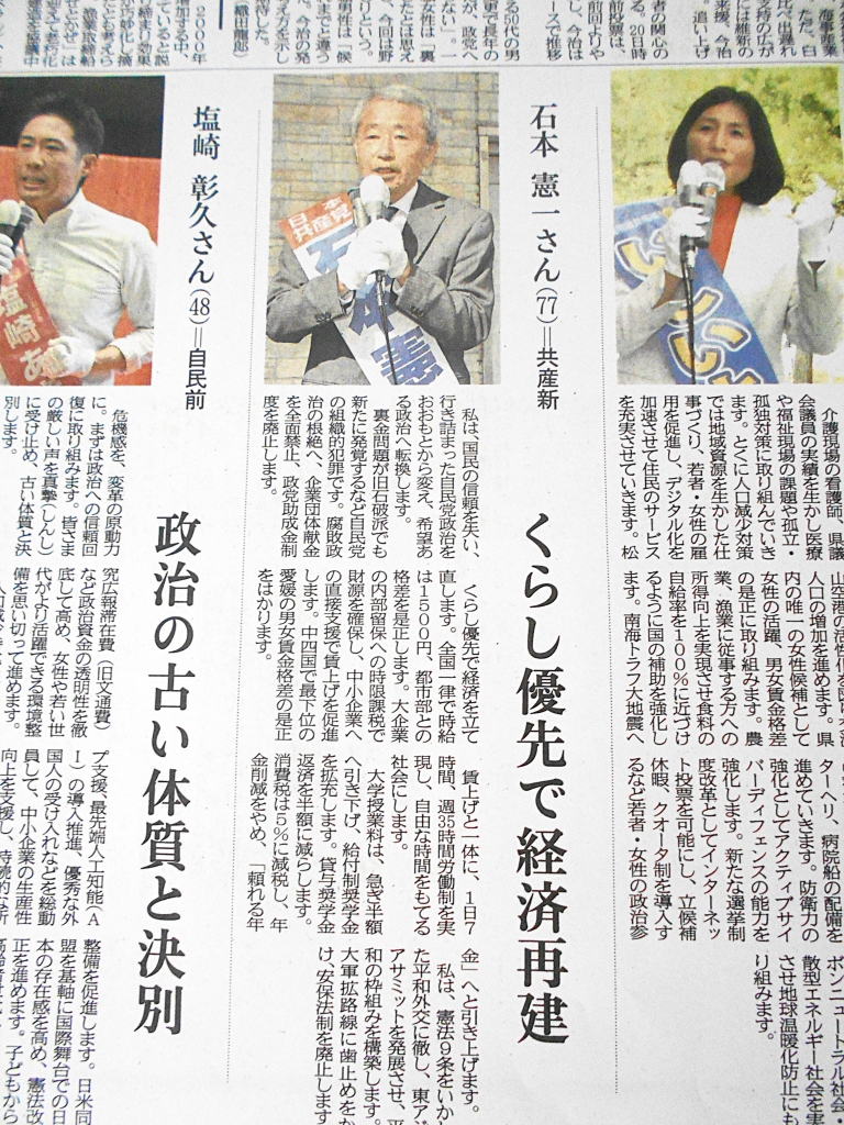 今朝の愛媛新聞。愛媛1区の候補者の公約。裏金政治根絶、くらしの底上げ、憲法9条いかした平和外交−自民党政治をおおもとから変える。石本憲一候補の訴えが凝縮されています。